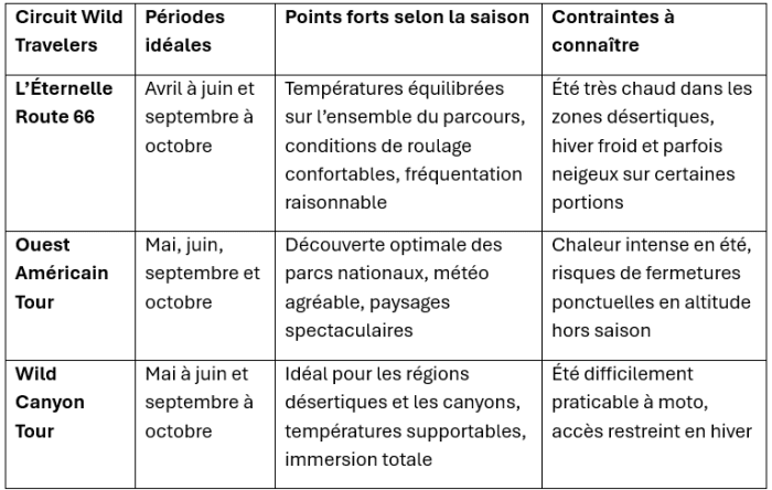 Chaque circuit Wild Travelers traverse des régions emblématiques des États-Unis, avec des contraintes climatiques bien distinctes. Le tableau ci-dessous permet de visualiser rapidement les périodes idéales, ainsi que les avantages et les limites de chaque itinéraire selon la saison.